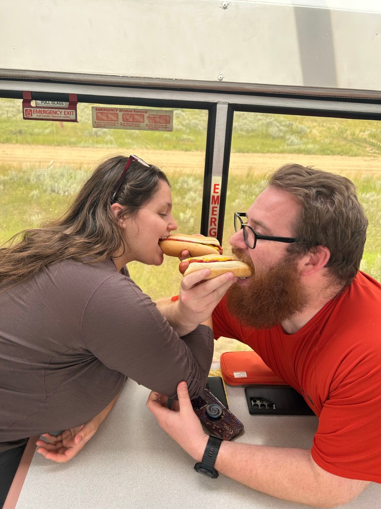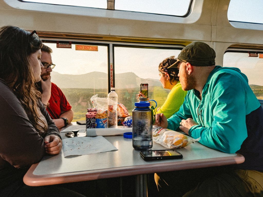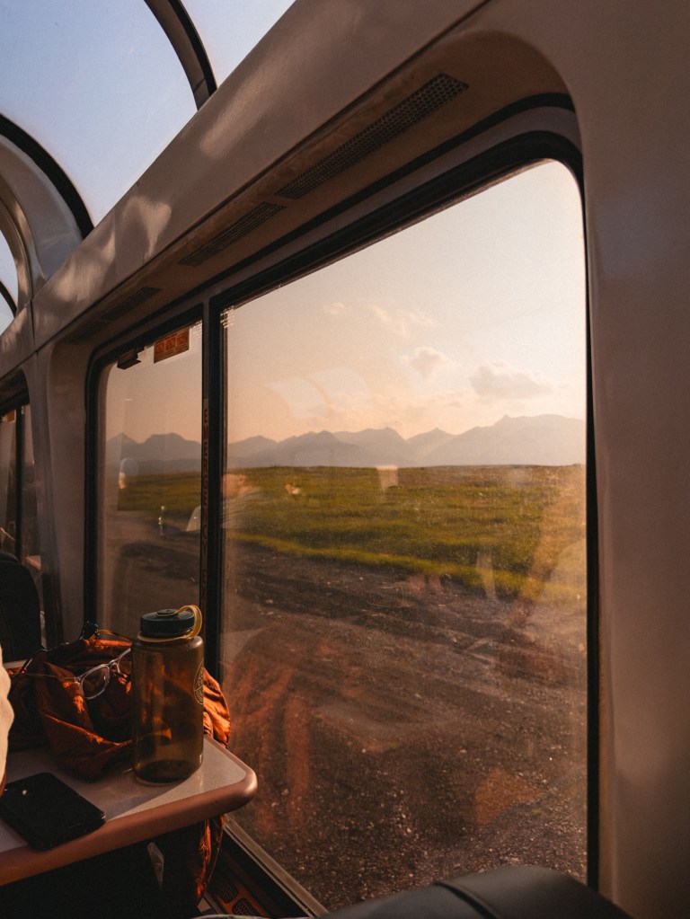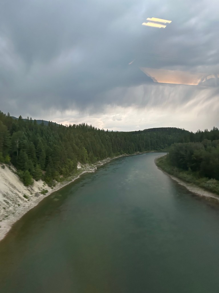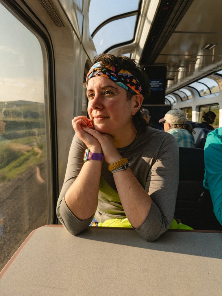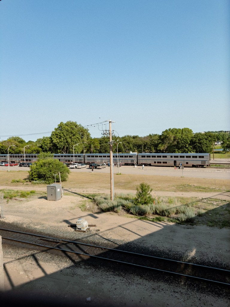 Furthermore, the observation car, which was directly behind us, provided a delightful traveling community space. The observation car had windows that went up and across the ceiling, and tables to sit around and gab. The previous evening we’d been treated to a wicked lightning storm that we watched across a lake, the light flashing with such frequency as to make a sort of static electricity metronome. We’d eaten microwave hotdogs, played Farkle (a dice game), and then all nestled back into our seats for a genuine evening of sleep.