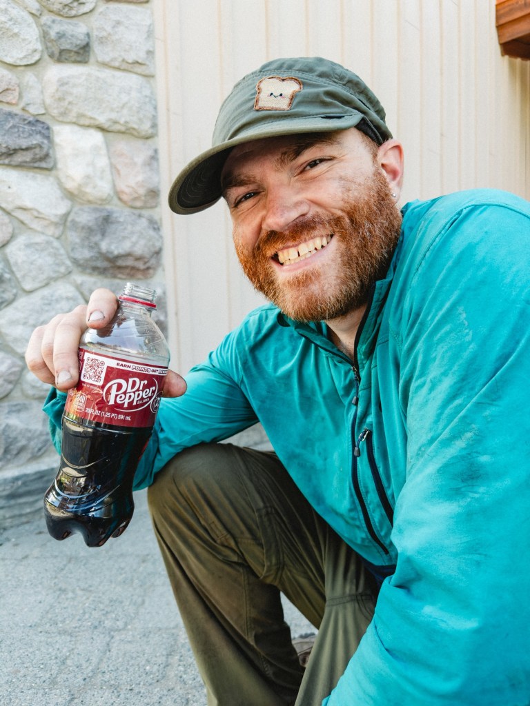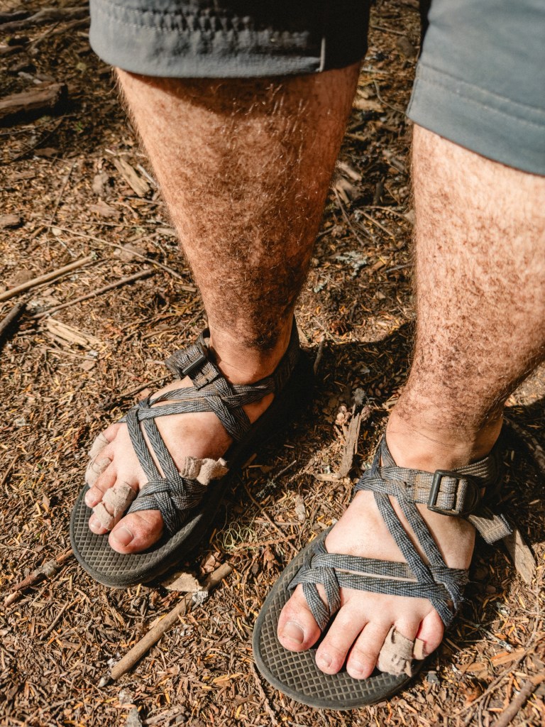 About 150 feet later we saw a perfect Looney Toons human body splat outline in a tangle of brambles, where someone else clearly suffered a similar fate that I had just lived through. At the bottom of the mountain we came across James, who was laying on the trail in a tiny patch of shade, his left ankle swollen to double its normal size. We quickly learned that it was his body print that we’d seen. We collected some icy river water in a Ziploc for him to ice his ankle, and a kind pair of SoBos from the Netherlands helped him wrap it in a bandage. James had recently finished several other long distance hikes, so he was very hardy, and able to slowly hike his way out. Even with a likely broken ankle, we never caught back up to him.