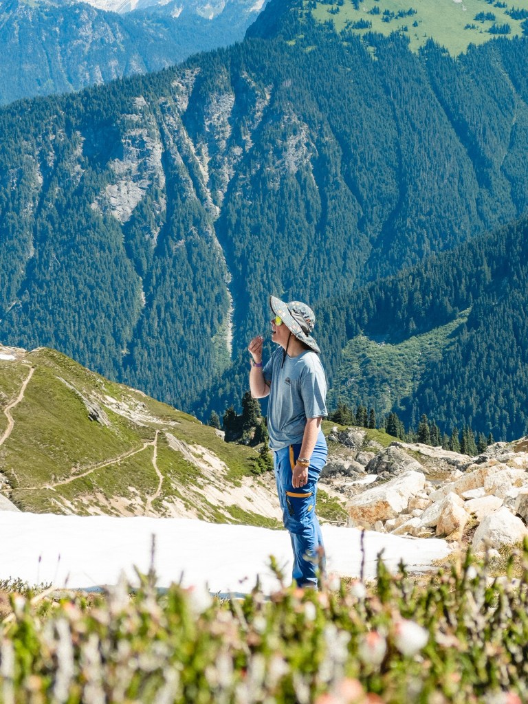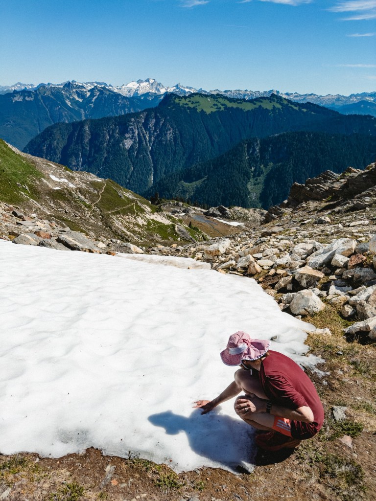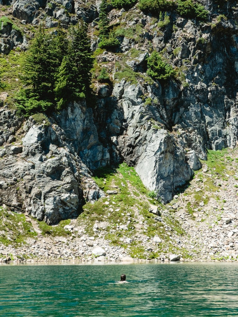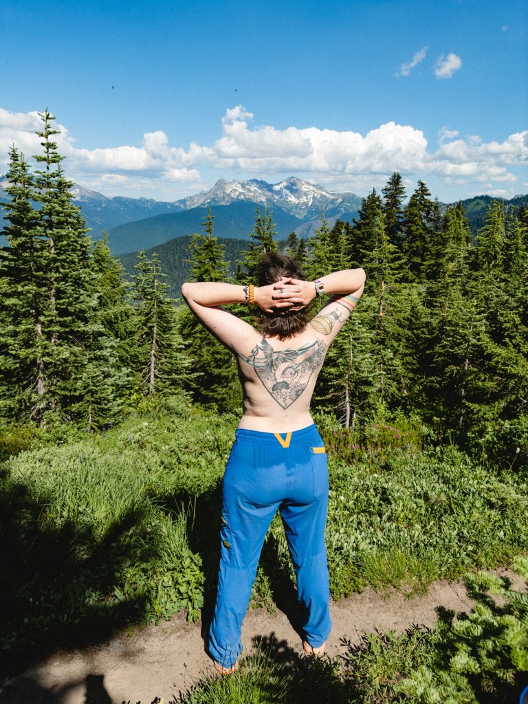 The highs and lows were wildly vascillating. I found stinging nettle with my butt when I crouched to pee, and a pika ate Toasty’s hiking pole straps while he slept. In contrast, I had the monumental privilege to dive into a frigid mountaintop lake made of only glacial snowmelt, my heart singing as it thrummed in my chest, the water so clear and aqua as to be made of liquified blue gummy bears. There were multiple hiker dude-bros eating lunch the same lake, but I went in shirtless anyway, my top surgery scars blazing bright in the midday sun. I saw the sun glitter on Glacier Peak. We passed 100 miles of hiking and I only cried 6 times.