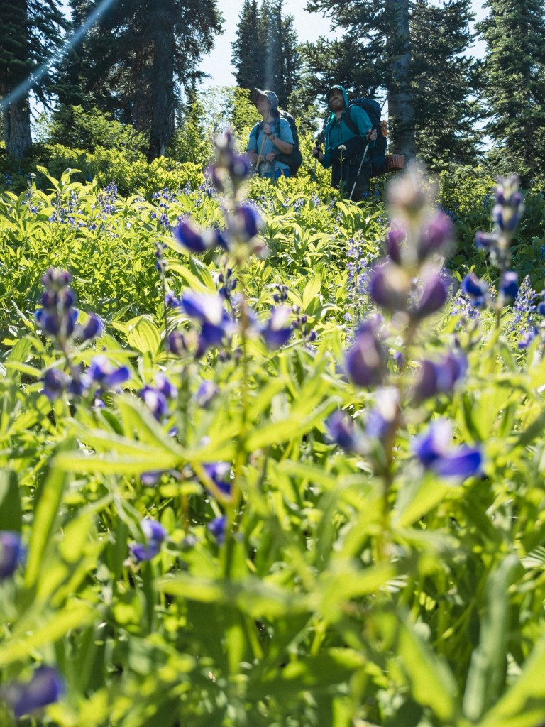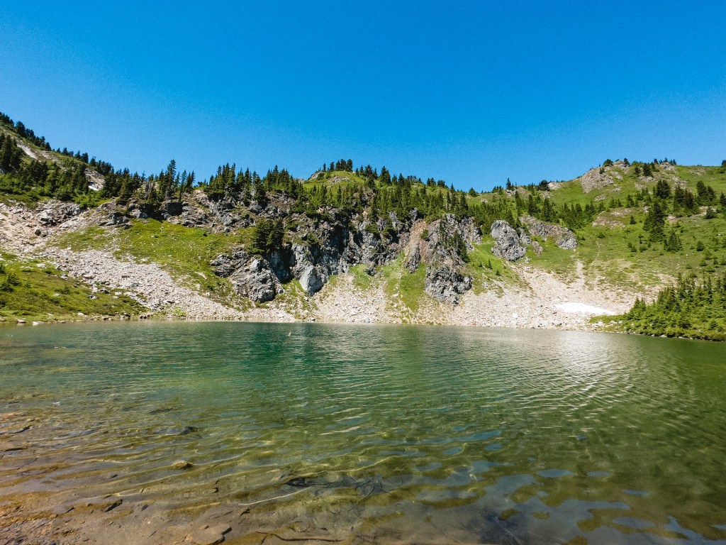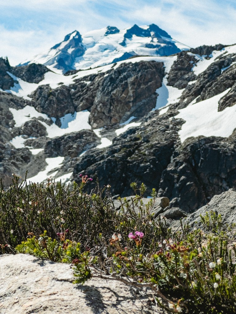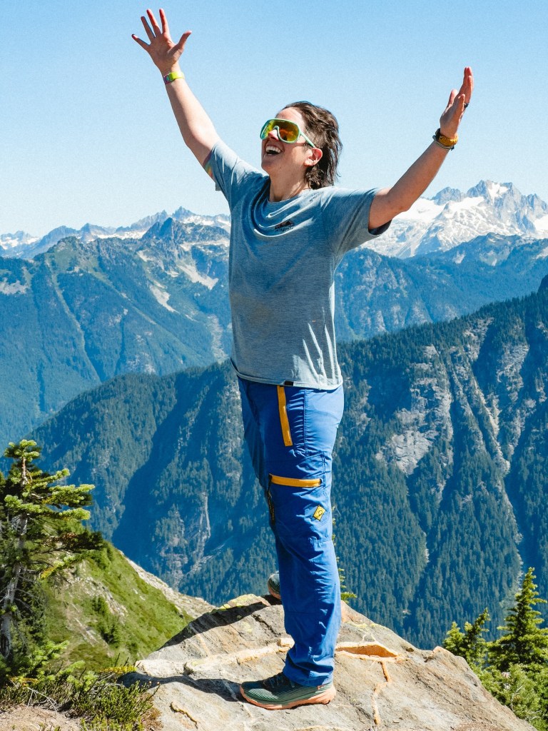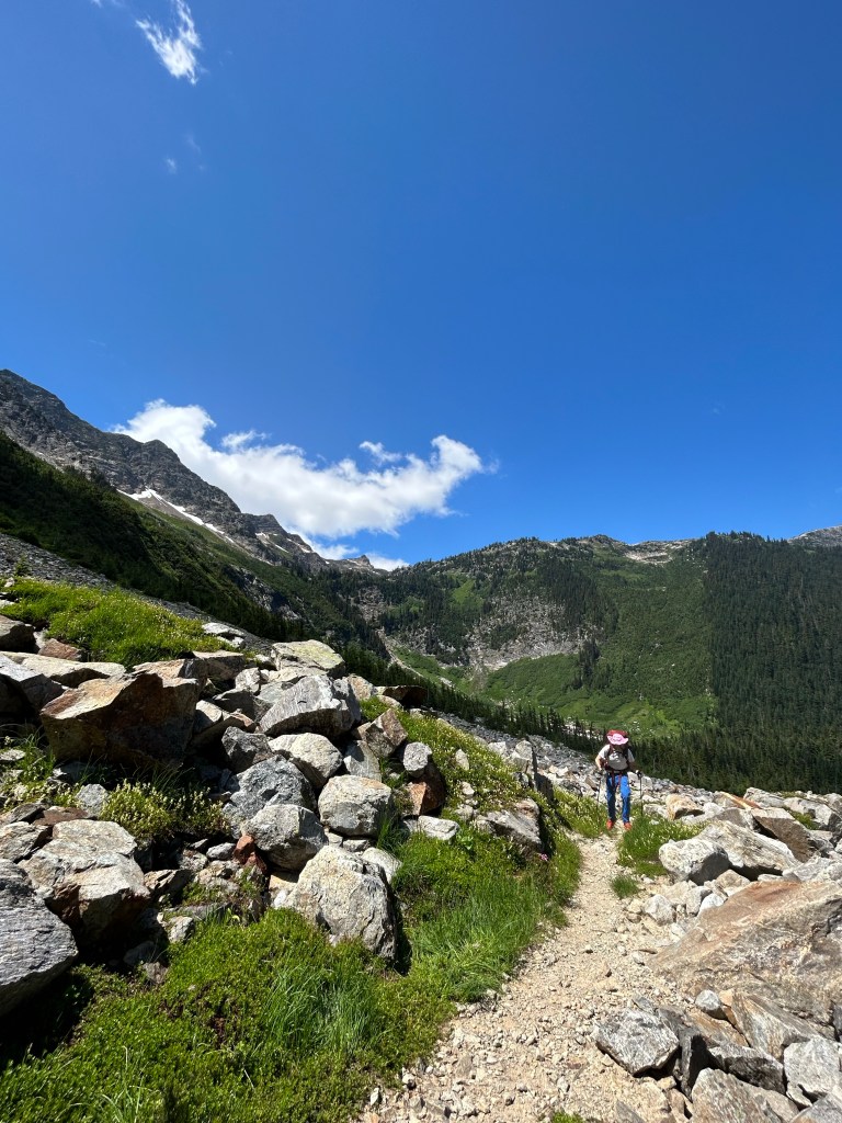 The highs and lows were wildly vascillating. I found stinging nettle with my butt when I crouched to pee, and a pika ate Toasty’s hiking pole straps while he slept. In contrast, I had the monumental privilege to dive into a frigid mountaintop lake made of only glacial snowmelt, my heart singing as it thrummed in my chest, the water so clear and aqua as to be made of liquified blue gummy bears. There were multiple hiker dude-bros eating lunch the same lake, but I went in shirtless anyway, my top surgery scars blazing bright in the midday sun. I saw the sun glitter on Glacier Peak. We passed 100 miles of hiking and I only cried 6 times.