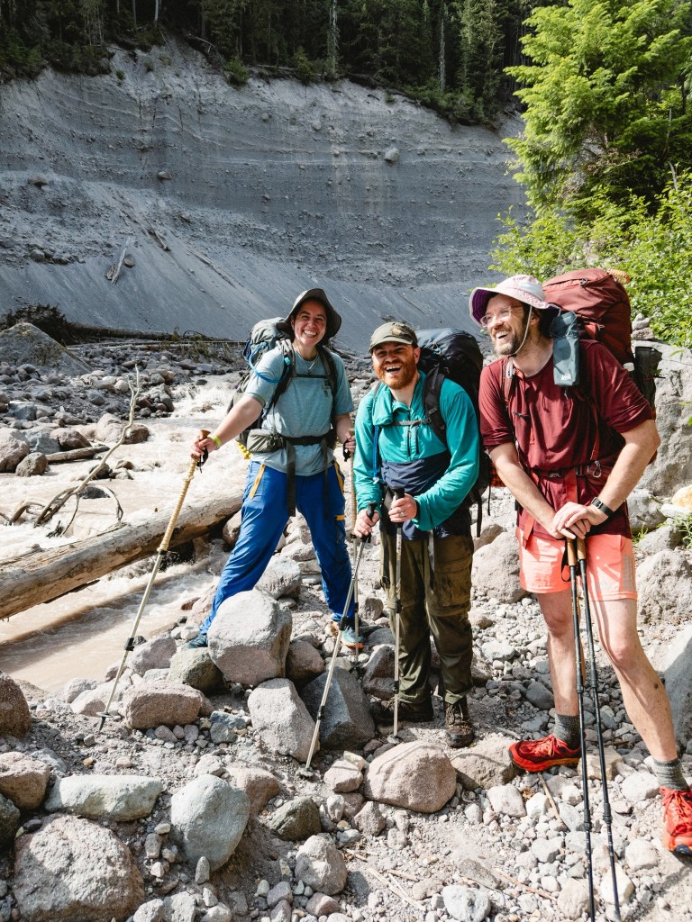 On the 6th day, we were confronted with a raging white water river, opaque as chocolate milk, inundated with glacial silt. It was at the base of an enormous rockslide that was actively still dropping rocks from 60 feet above our heads, menacingly looming over us as we stared, gobsmacked at the river we were going to have to navigate across. There were no logs or rock hops – we were going to have go go in. We’d done several river crossings already, but none had been torrent, and all the other ones had clear water, so we could see where we were stepping.
