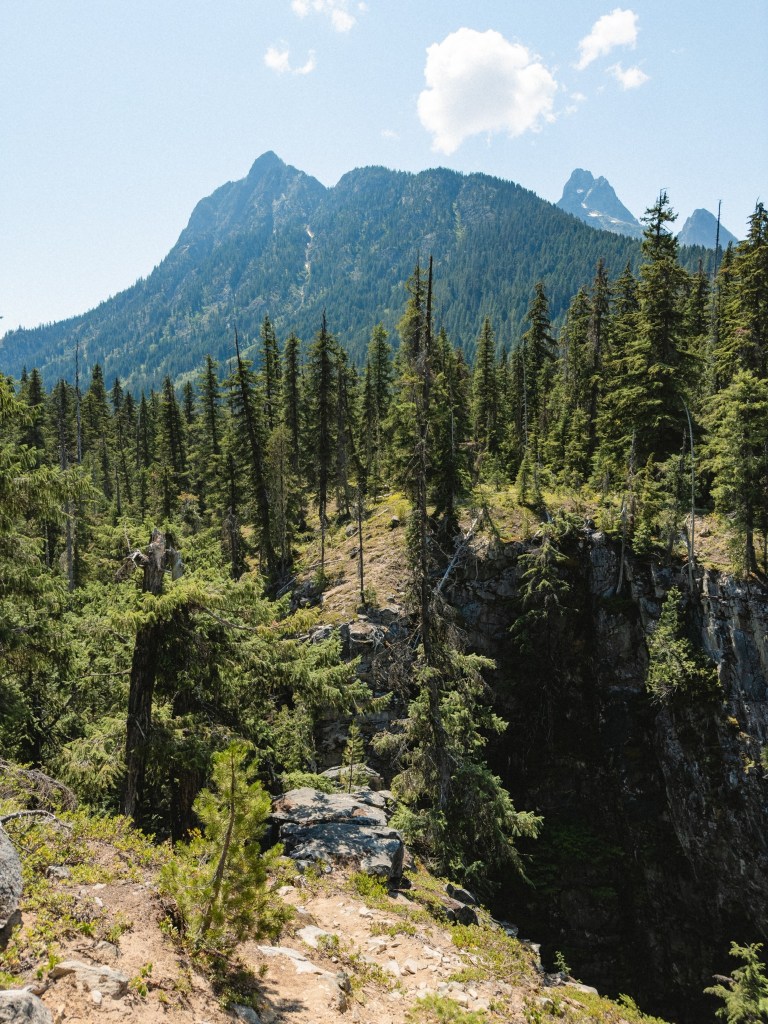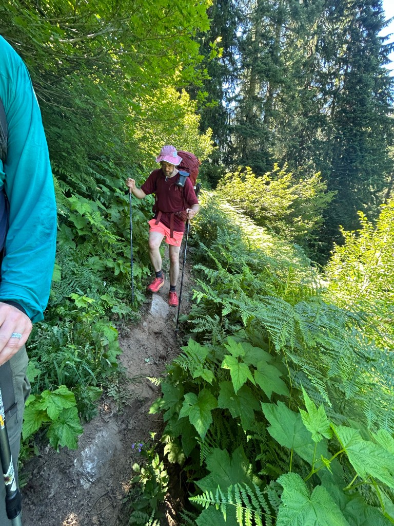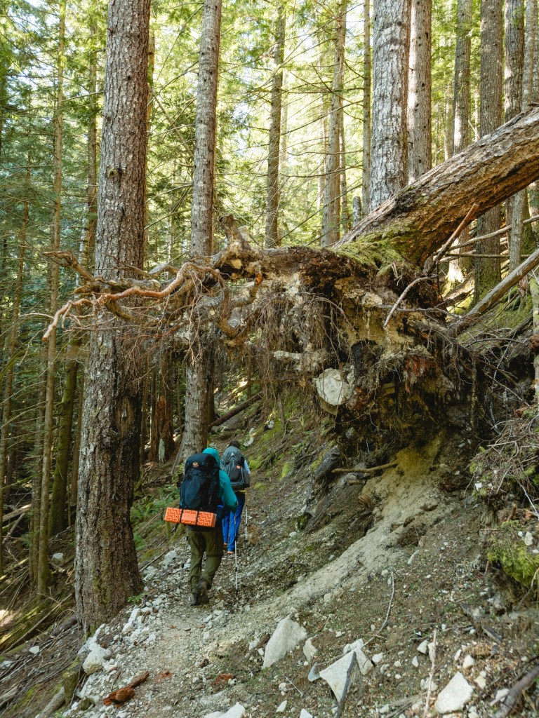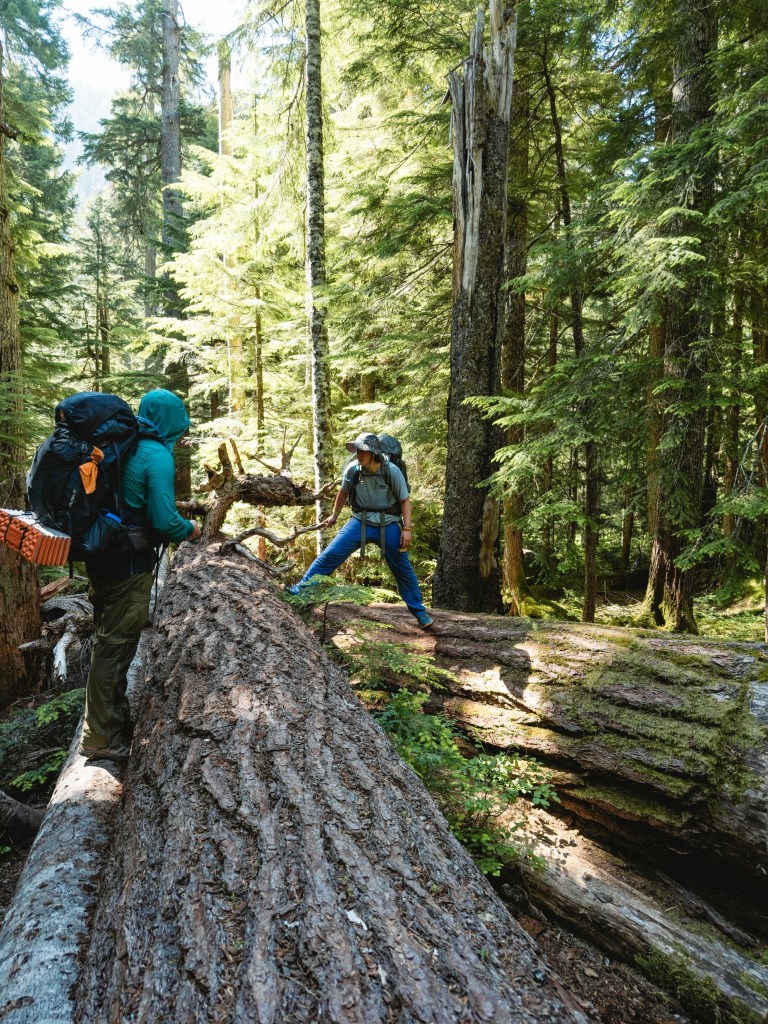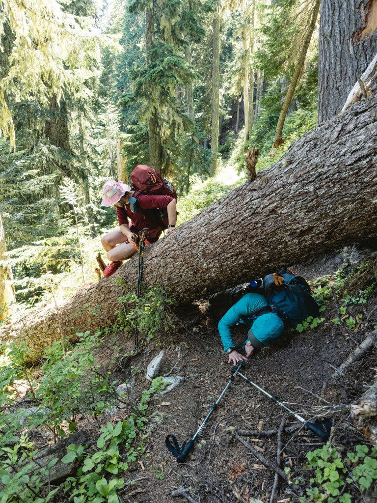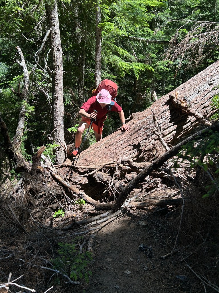 The section of trail between Stehekin and Stevens Pass is 110 miles long, 25,081 ft of total elevation gain and 23,077 ft of descent. 95% of it goes through a protected Wilderness area. What that means is that there aren’t any bailout points, and the rare trail maintenance can only happen when the forest service helicopters in a pile of equipment every couple of years. What this translates to for hiking is that you get to immerse yourself in spectacular, untouched, glorious mountains, while also being routinely whipped in the mouth by thorny brush that has overtaken the trail, and clambering over enormous, 5-foot thick blown-down trees at 45 degree angles perched terrifyingly over sheer cliff faces and blocking the trail. There’s nothing quite like being face-down on a gigantic, creaking log, hugging it against your chest for dear life as you slowly tilt your body around it, wondering what will happen first: if your pants are going to blow open at the crotch or if you’re going to plummet to your death. Maybe both simultaneously!