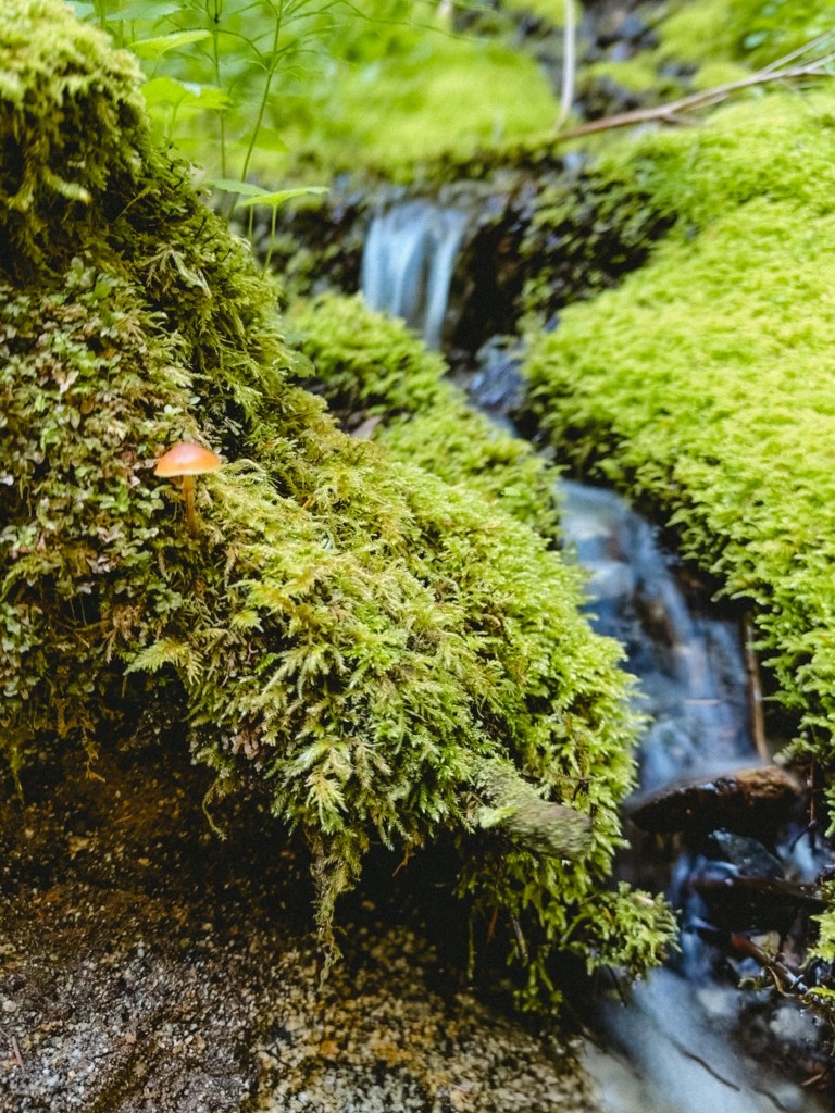 Once I found footing I stood up, the water cascading around my legs. I shuffled through, being careful not to cross one leg in front of the other, using my hiking poles as balance points. My shoes gripped better than I’d expected on the invisble slick rocks, and as I went, I shouted information back to the 3 boys about the terrain under the water. Big rock here, submerged log here, etc. When I made it past the first section, to the loose, damp rock pile slightly out of the water, a whoosh of relief went out of me and I bellowed out in triumph. One by one Toasty, Dumptruck, then Barefoot Nick made it across. Just before he stepped out of the water, Barefoot Nick looked a bit like he was about to lose his footing. Without hesitation Dumptruck leaned back out over the flow, grabbed our forest spirit’s outstreched hand, and pulled him up onto our little island.