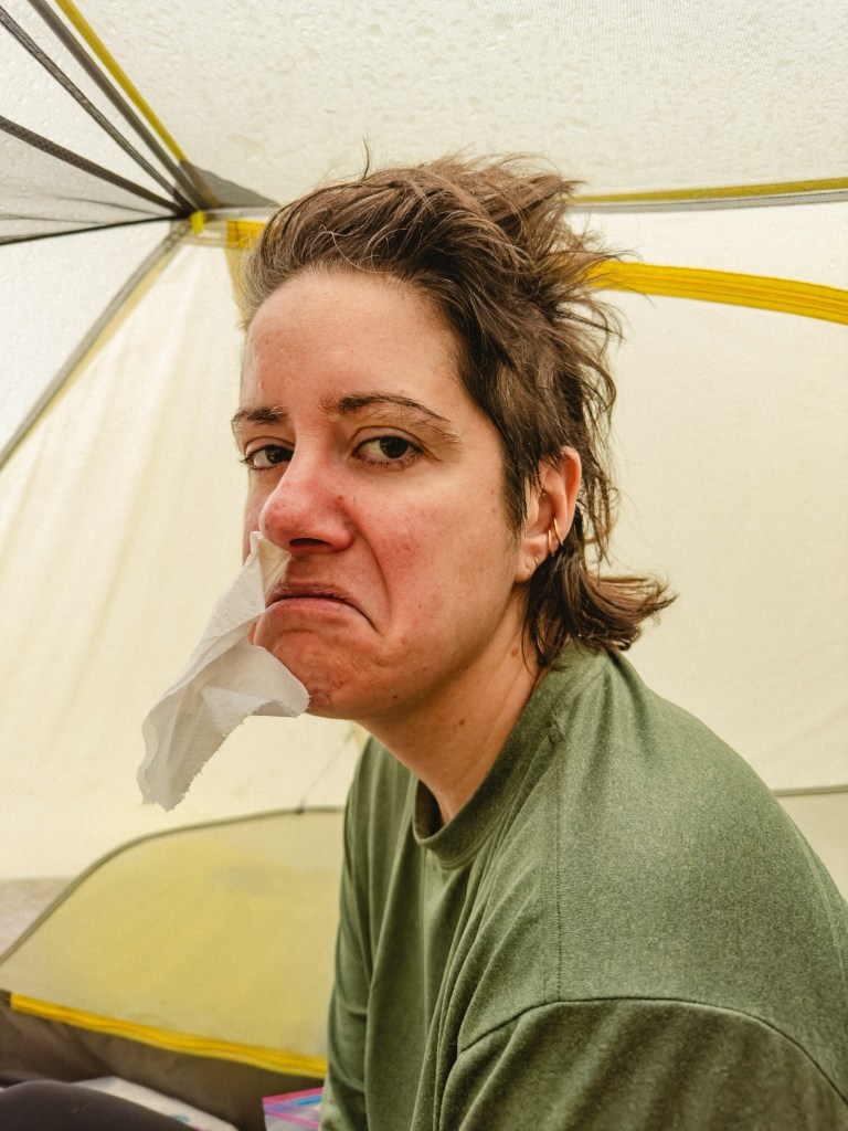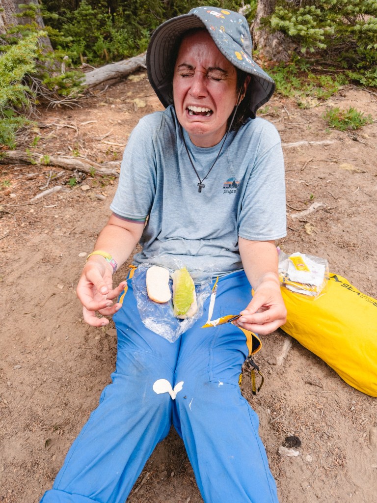 The joy is a necessary contrast to the comedy of small miseries that are the inevitability of living in the woods. I woke up with a terribly bloody nose (from all the dust on the trail being kicked up into my sinuses) the same morning that a mouse had merrily crapped all over Dumptruck’s shoes. There was an overnight storm that was so wild as to cause Dumptruck to be up all night, the wind buffeting the tent into his skull at regular intervals. A bee fell into my open packet of tuna, rolling desperately around in the mayo before dragging itself to freedom. Argie excitedly thought he’d found one extra M&M in Toasty’s trail mix, only to discover, horrifyingly, that it was in fact a raisin. The soles of Dumptruck’s shoes are falling apart, and are currently vaguely held together with super glue, duct tape and dreams. I accidentally ripped open a packet of mayo with such enthusiasm that it exploded its entire contents all over the knees of my already disgusting pants. Dumptruck passed gas in our tent that was so nauseating that I called out “Argiiiiieeee, Dumptruck farted in here.” To which Argie replied, “Awwww, do you want me to come over and fart in there too?”