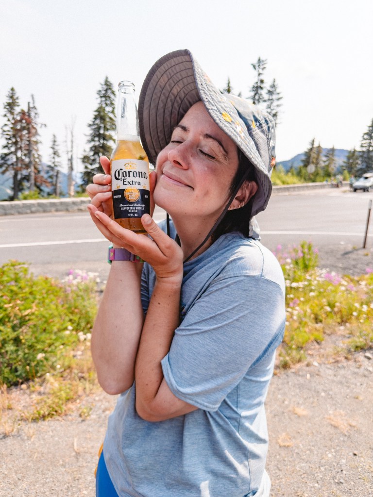 The next day we passed through Chinook Pass, a small parking lot with bathrooms whose level of disgusting approaches legendary. But we were greeted almost immediately by a pair of weekend hikers who gave us their unopened food, and there was a minor feeding frenzy as hikers ravaged the open bear cannisters, trading goods and bartering for fancy beef jerky. At the same time, a young man pulled into the parking lot with a flat tire, totally flummoxed as to what to do. Dumptruck, ever the generous project-happy person, immediately changed it for him. About 10 minutes later, we were approached by a woman who announced that her name was Mindy, and she and her buddy Leslie were setting up a grill station and had beer, hamburgers and hot dogs for thru-hikers. Our jaws hit the pavement, and we staggered over to the oasis of glory, wondering if it was real or if we’d finally descended into the realm of hallucination.