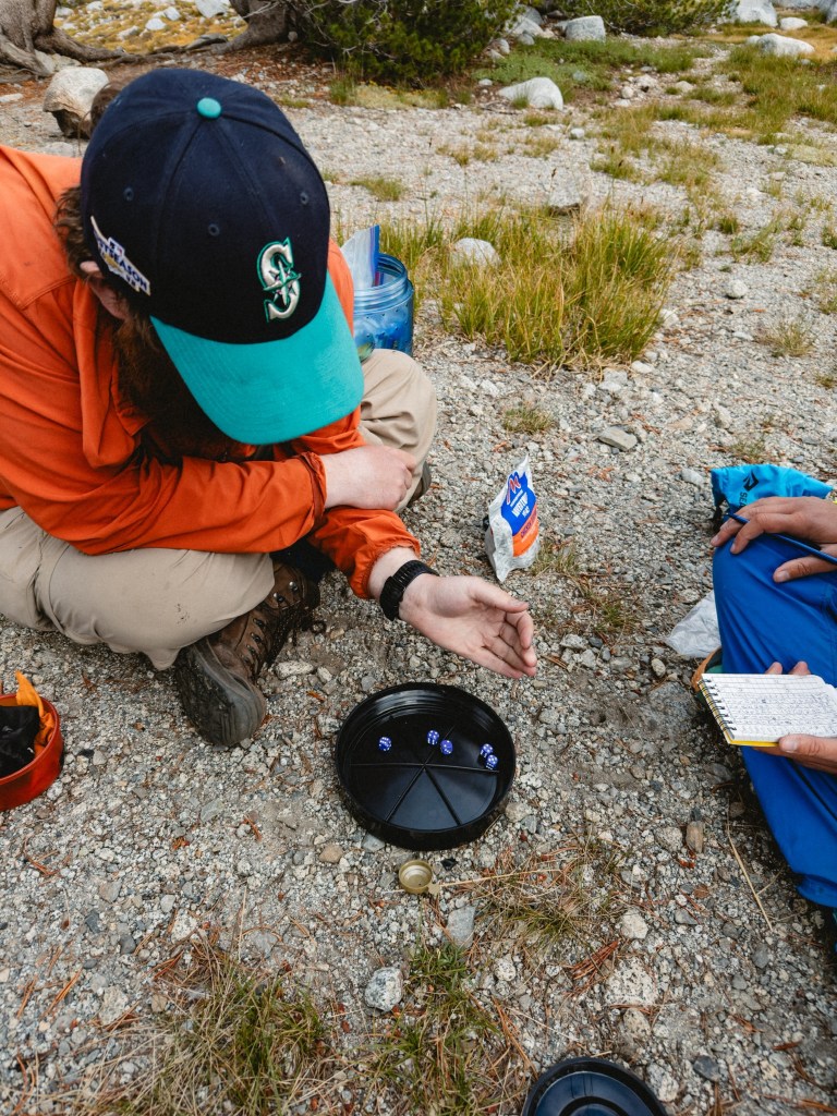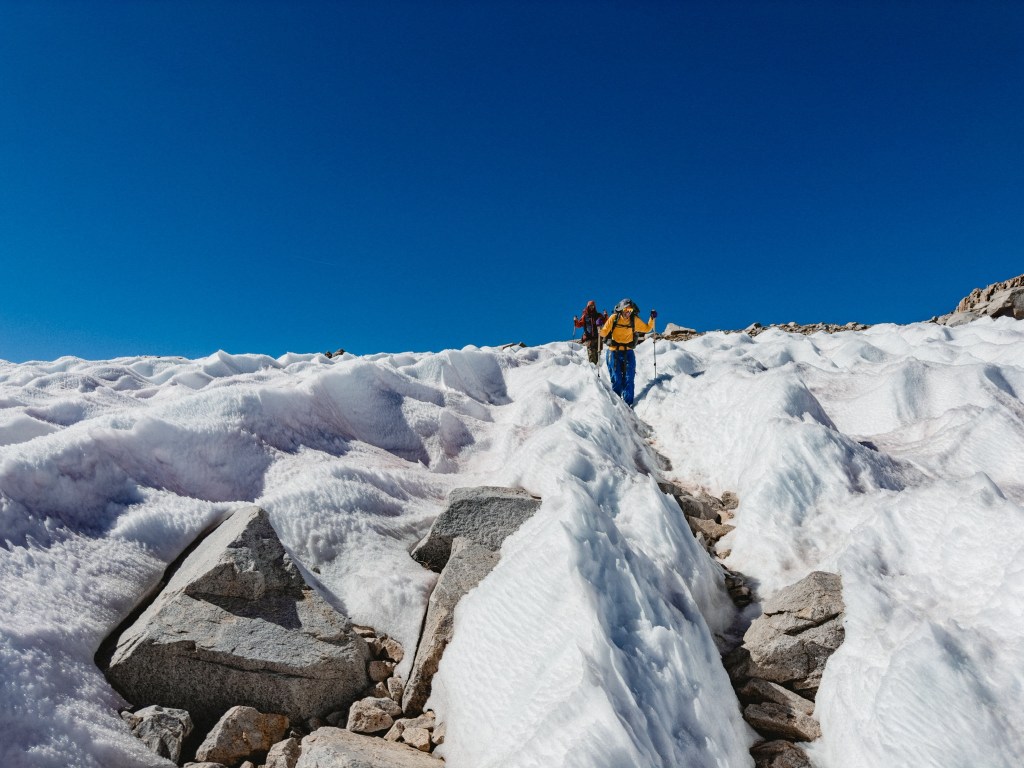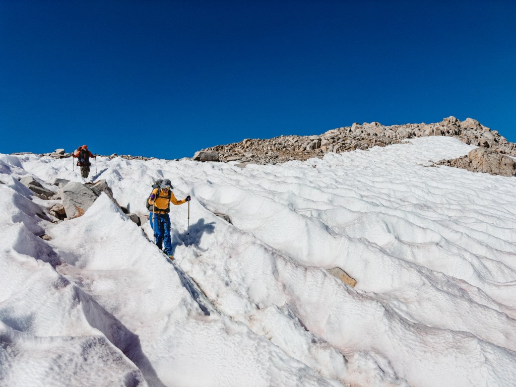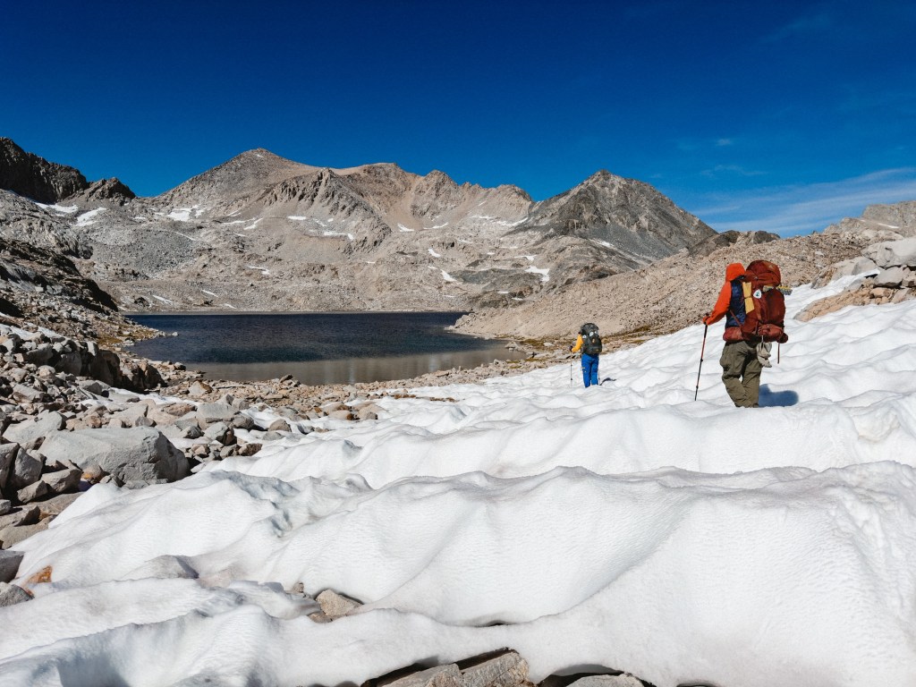 The Sierra has been wrapping up our tired hiker bodies in unfathomable beauty. The late snow melt means that we have been staggering down cliff-faces half drowned in bellowing waterfalls, water molecules leaping joyfully free of their frozen imprisonment to sail sparkling back into the open air. Meanwhile, enormous swaths of stubborn snowfields still cling resolute to the highest passes. Sun cups have turned the deep snow into a turbulent ocean frozen rigidly in place, our determined feet sliding up and down the swells, our forms temporarily disappearing behind perfect waves paused mid-crest. Impeccable, pristine alpine lakes of untouched aqua-blue wait just around every bend of the trail, the water so indescribably clear that to swim with goggles would feel like a deep insult to Mother Nature. Fish and round-bellied late-season tadpoles flick their tails through the crystalline sublimity with no mind to how luck has placed them in one of the true corridors of untouched wild.