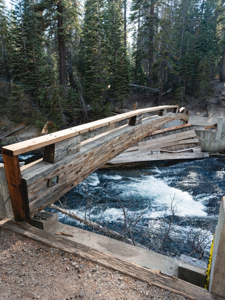 About a week ago we took a zero day at a small cabin on the West side of The Sierra, about an hour drive on the most terrifying road I’ve ever been on. It was mildly paved, barely wide enough for the Prius (let alone 2 cars), pock-marked with gaping car-swallowing pot-holes and followed winding switchbacks on a cliff’s edge, the path wedged claustrophobically between boulders. It gave the feeling that we’d somehow taken a wrong turn and were driving the Prius pell-mell down a side trail that someone had accidentally spilled some asphalt onto. Once or twice an oncoming car approached, and we’d have to stop and reverse until we could find a crumbling dirt turn-out to creep slowly backward into, our hearts in our mouths, taking it on faith that the turn-out had some kind of rock underneath it and wasn’t just a Looney Toons style drop-out, Wile E. Coyote waiting just below with a manic grin, fork, knife and bib. We made it through, given Toasty’s profound skill, and got to Highland Lake.