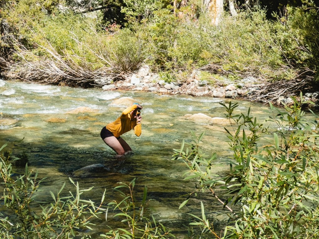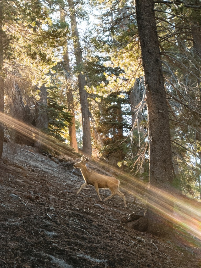 One afternoon we arrived at camp earlier than expected, and rather than continue hiking, we stripped to our underpants and climbed into the huge, cascading creek next to the tent site, shrieking joyfully at the shocking cold. After emerging, we plopped our wet butts on a warm, smooth expanse of rock to dry in the afternoon sun, our eyes trained up to the staggering peak of The Hermit laid bare before us, reaching up with hands outstretched to the boundless lavender of sunkissed sky. Argonaut nudged me with an elbow and pointed over our shoulders, and I turned just in time to see two elegant female deer and a small, energetic fawn tiptoe their way delicately past our tents, light dappling their sandy fur.