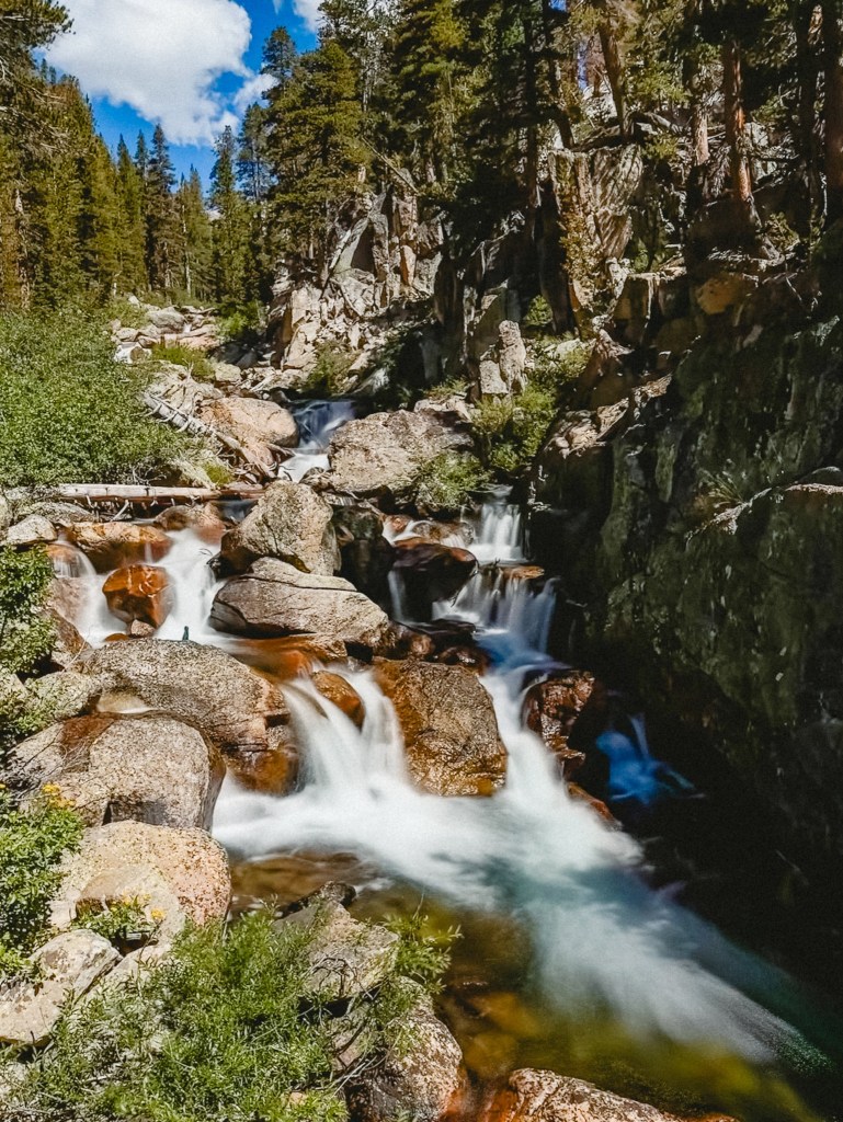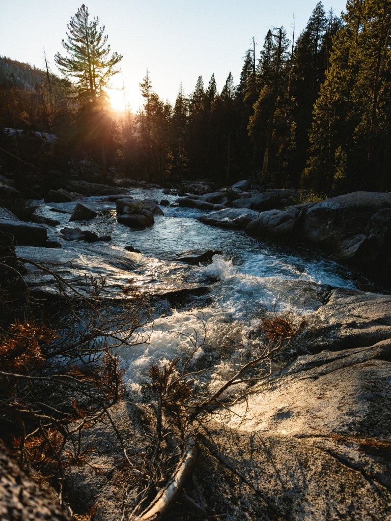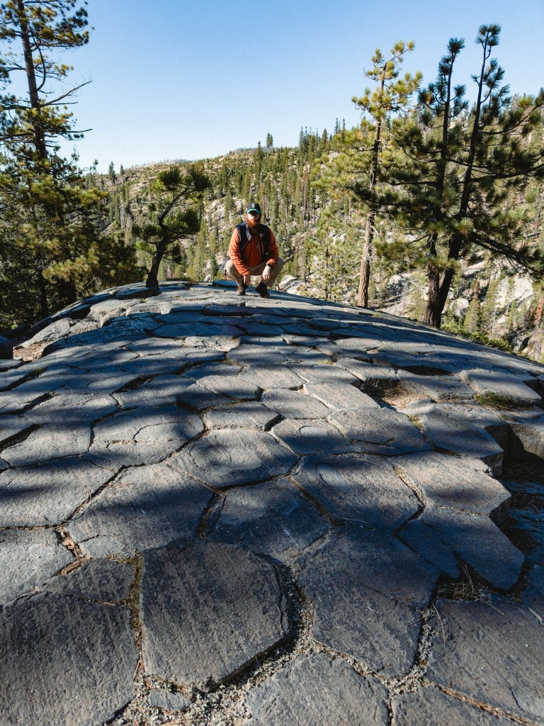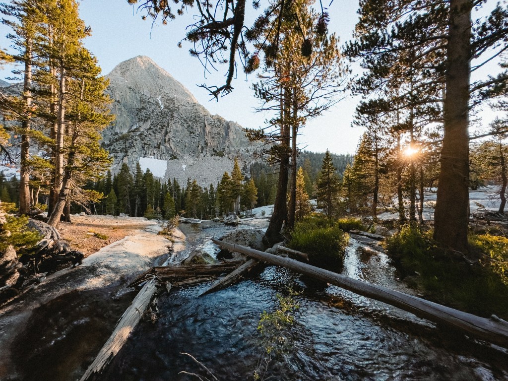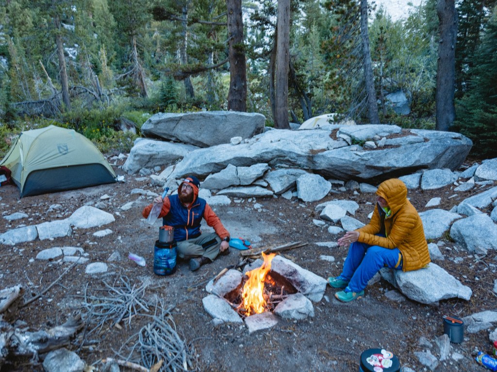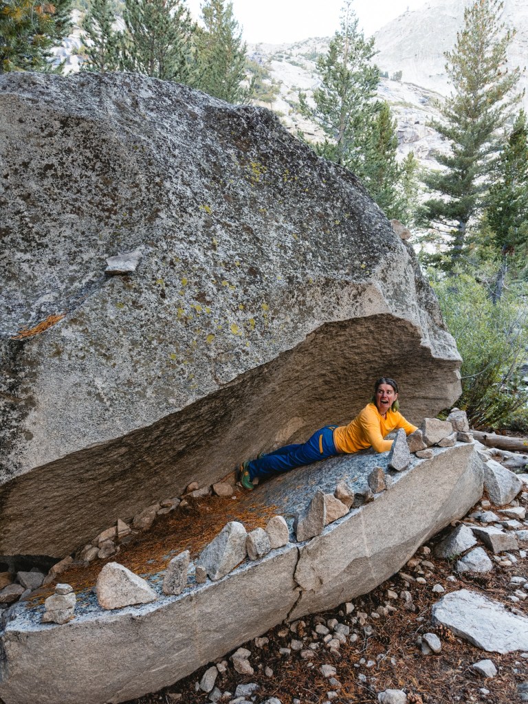 One evening we stopped a bit early, sort of because we were tired, but more truthfully because we came across a campsite with a rock monster that sent me into such throes jubilation that I simply couldn’t leave. The rock monster was a huge boulder whose lower third, at some indeterminate point in the past, had broken off and fallen down to the ground, making a gaping maw. Some wonderful person (I wish I knew who) had placed smaller rocks along the bottom ridge, making a large toothy mouth. This campsite was additionally situated directly next to the waterfall we’d been hiking alongside for the past several miles, and also had a beautifully (and safely) constructed fire pit. So, for the first time on trail we had the ultimate reward of a small campfire. Sidenote: this was a campsite below 10,000 feet so fires were permitted, Dumptruck is a fire safety expert, we made only a small fire, there was no wind, and we extinguished it properly. Please don’t burn down The Sierra. It would be a real bummer, and Smokey the Bear will be cross with you. You don’t want that. Smokey can be a right brute when he’s mad. He’ll use all your dishes and leave them dirty in the sink, clog your toilet, eat your leftovers without asking and terrorize your cats. Real monster that guy.