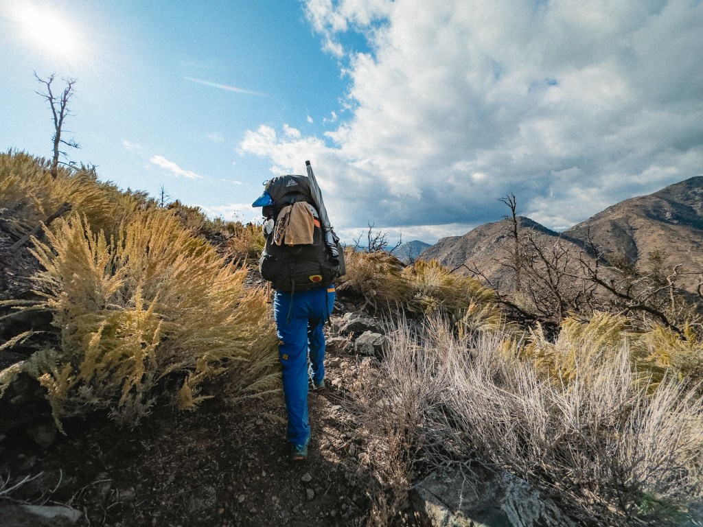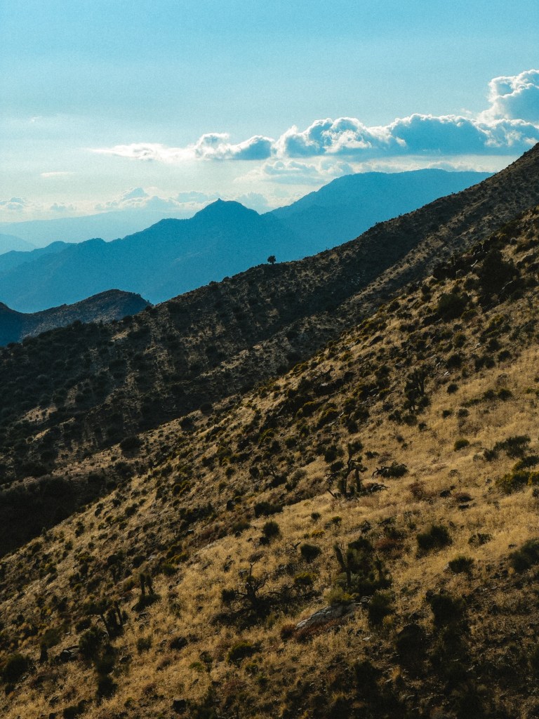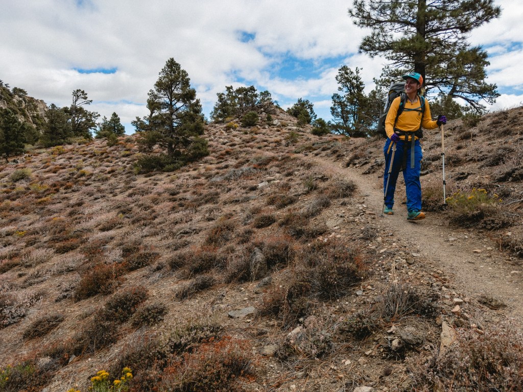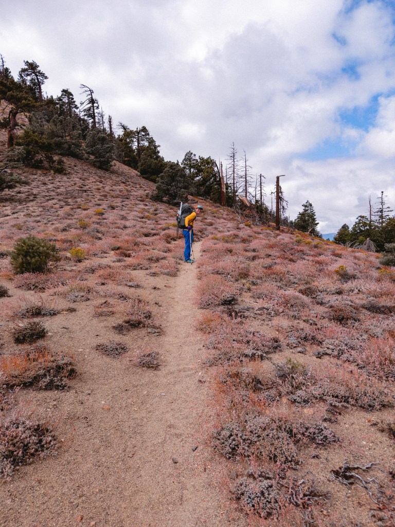 All of the plants are far past bloom, but to be disappointed would be an insult to the beauty that remains. There are fields of fluffy, tiny pink bushes that make me feel like I’m hiking through a field of cotton candy. Brilliant yellow stalks wave in the wind and bright sunlight, while soft bushes of mint-green poof out sunny pollen as we hike through them. Water sources are getting few and far between, but we can see them from miles away, bright green glades nestled into the crevices of mountains, oases of trees and clear, burbling springs. Walking into these glades feels like walking into an air conditioned store in the middle of brutal summer, the cool air like a portal to another dimension.